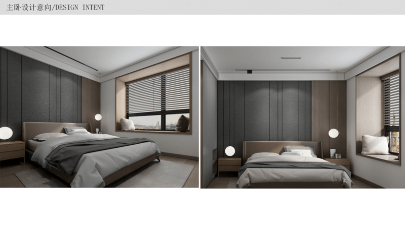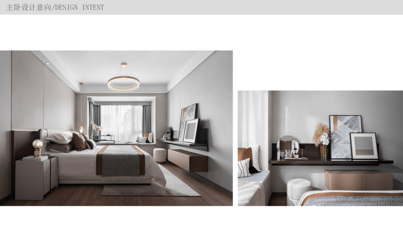 主臥 交付時(shí)帶有飄窗,可以將飄窗位置利用起來(lái),改造成一個(gè)mini的學(xué)習(xí)區(qū),背景墻按照風(fēng)格和喜好做硬包,在床尾設(shè)立斗柜和化妝臺(tái),滿足女主人的日常需求,因?yàn)橹髋P帶衣帽間,所以收納已經(jīng)足夠了,主要以裝飾和體驗(yàn)感為主。