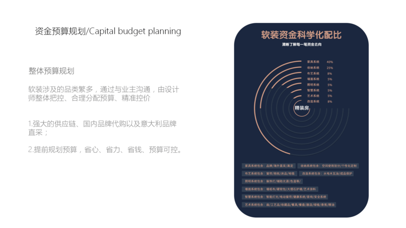上圖是大概軟裝設(shè)計(jì)所包括的類目和價(jià)值占比,現(xiàn)在精裝房越來(lái)越多,而軟裝設(shè)計(jì)師就是是從整體上綜合策劃裝飾裝修設(shè)計(jì)方案,體現(xiàn)出居住者的個(gè)性品位。
