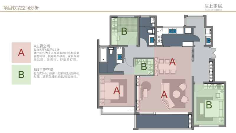 對(duì)于整體空間,一定要有主次之分(如上圖),整個(gè)空間一定以客廳、門廳、餐廳,同時(shí)包括主臥作為整體空間的 主要空間,當(dāng)然使用頻率相對(duì)更高,家具更強(qiáng)調(diào)品質(zhì)和美觀,同時(shí)具備舒適性,便于打理。