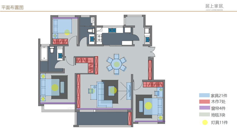 可以看出,以常規(guī)布局統(tǒng)籌出來(lái)家具、整體定制柜、窗簾、地毯、燈具等需要的數(shù)量;