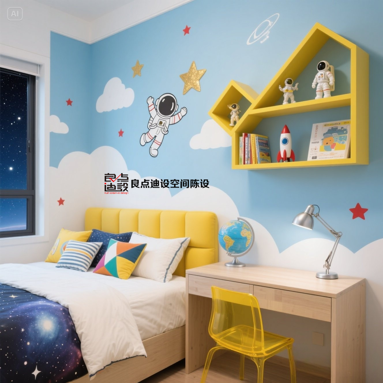 2?? 元素統(tǒng)一: 宇航員壁畫→擺件→床品細節(jié),主題感瘋狂輸出??